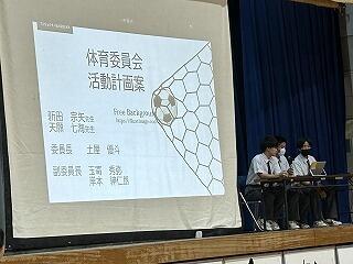 ステージ上には議長団、ステージ下左手には生徒会総務、右手には各種専門委員会の正副委員長さんが整列し、提案は準備したスライドをもとに、ステージ上の提案席で行います。