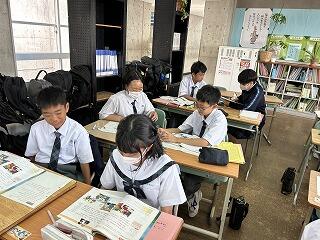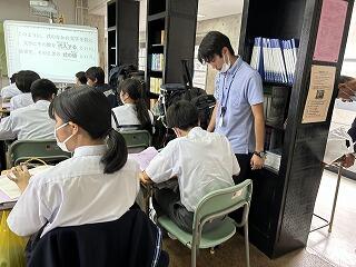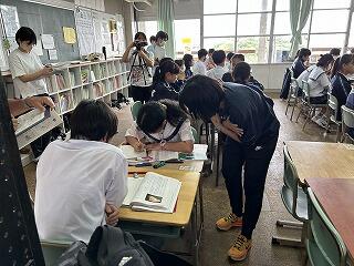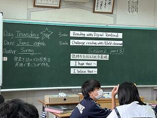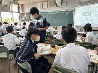 1年5組の英語の授業ではペアで本文の読み取りを行っていました。伝えようという意識がしっかり表れていました。