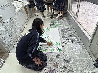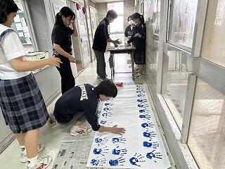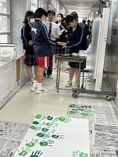 3年生が廊下で楽しそうに活動しているので何をしているのか見てみると手に絵の具を塗って手形を押していました。