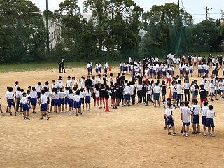 各団の団長、副団長が決定し、今年度初めての団での取り組みになりました。1年生から3年生まで20名がひとチームとなって大縄跳びにチャレンジです。各団決められた時間に何回跳べたかを記録して3チームの平均値で対決します。今日と明日の2日間の戦いとなります。各団の団長をはじめとするリーダーが声を出し、みんなで楽しくチャレンジしている姿は素晴らしいです!進行の生徒会総務、放送委員の皆さんの仕切りもバッチリでした。今日のところトップはA団。明日も楽しみですね!!!