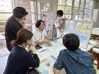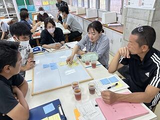3年生が総合で頑張った後は、先生方がワークショップで授業反省会を行います。どのような点が良かったのか、探究に導くための手立てはどうするべきかなど、ファシリテーターやガイド役の3年の先生方、授業を参観した1、2年の先生方がチームになって、お互い意見を出し合いました。