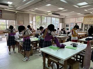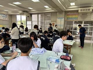 本校では家庭科の授業で浴衣の着付けと帯結びの学習を行っています。和の文化に触れることもとても大切ですね。京ごふくよしだの狩俣先生に今年度も講師をお引き受けいただき、前期と後期に分けて3年生全クラスがお世話になります。手順にそって帯結びが完成するとタブレットでお互いに撮影して記録を残します。みんなきれいに着ることができました!