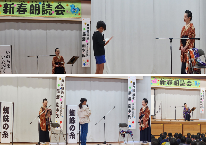 昨日の2校時・3校時に、舞台朗読家の「熊澤 南水先生」をお招きして、新春朗読会を行いました。低学年には、「ソメコとオニ」「いのちをいただく」、高学年には、「いのちをいただく」「蜘蛛の糸」の2作品を朗読していただきました。南水先生の声に引き込まれながら、児童は心の中で、作品の世界観や浮かんだ映像を思い描く様子が見られました。体育館がシーンと静まりかえり、「いのちをいただく」では涙を浮かべる児童もいました。新春にふさわしい、静かで密度の濃い時間が流れる、とても素敵な朗読会となりました。沖縄までお越しいただきました「熊澤 南水先生」に感謝申し上げます。