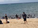 9月13日(金)修学旅行2日目。心配だった天気もどうにかもってくれて、マリン体験ができました。あいにく風が強く、「シーカヤック」はできなかったが、「ジェリーキャンドル」「ドラゴンボート」「リラックス」の体験ができました。また、砂浜ではビーチフラッグも行いました。