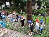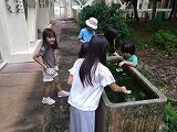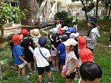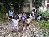 1年生の生活科の授業で、中庭で生き物探し。夢中で池をのぞき込む児童や草むらの生き物を探す児童。バッタやアメンボを見つけ大発見!とても楽しそうなひとときでした。