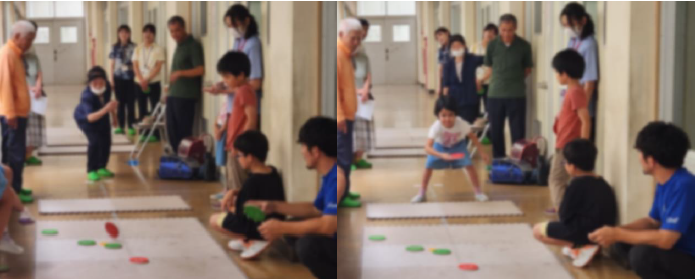 カーリングのようなゲームで、黄色い的をめがけて、城岳小チームと地域の大人チームで戦いました。とても接戦でしたが、第2ラウンドは7対5で子どもチームが勝ちましたよ。