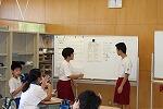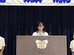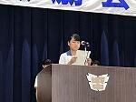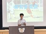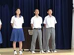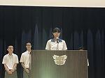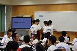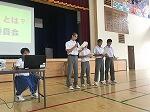 7/9(火)の朝会にて、県夏季総体の激励会と城熱博(学習発表会)についてのプレゼンを生徒会総務が行いました。