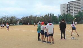 新体力テストを行っています。写真はボール投げとシャトルランです。その他,握力や50m走等々,体力・運動能力を測定します。