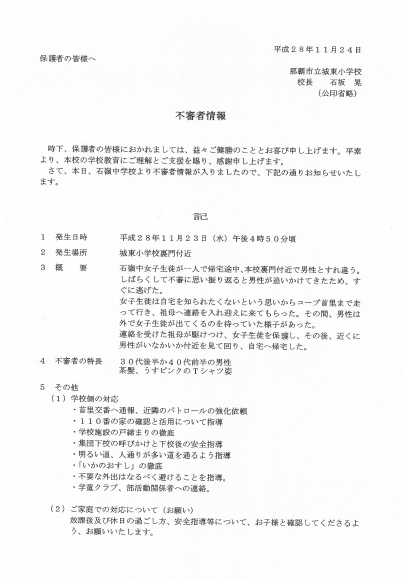 2016年11月の記事一覧 2016年11月 全ての記事 カテゴリ 今日の出来事 連絡事項 報告事項 ミーティング 本・雑誌 ニュース 映画・テレビ 音楽 スポーツ パソコン・インターネット ペット 総合学習 アニメ・コミック アーカイブ 2025年12月 (1) 2025年11月 (7) 2025年10月 (6) 2025年9月 (0) 2025年8月 (0) 2025年7月 (0) 2025年6月 (0) 2025年5月 (0) 2025年4月 (0) 2025年3月 (17) 2025年2月 (22) 2025年1月 (25) 2024年12月 (14) 2024年11月 (12) 2024年10月 (17) 2024年9月 (23) 2024年8月 (8) 2024年7月 (22) 2024年6月 (37) 2024年5月 (33) 2024年4月 (22) 2024年3月 (23) 2024年2月 (27) 2024年1月 (29) 2023年12月 (22) 2023年11月 (32) 2023年10月 (23) 2023年9月 (27) 2023年8月 (4) 2023年7月 (19) 2023年6月 (27) 2023年5月 (25) 2023年4月 (12) 2023年3月 (0) 2023年2月 (0) 2023年1月 (0) 2022年12月 (0) 2022年11月 (0) 2022年10月 (0) 2022年9月 (1) 2022年8月 (0) 2022年7月 (0) 2022年6月 (1) 2022年5月 (1) 2022年4月 (1) 2022年3月 (0) 2022年2月 (0) 2022年1月 (0) 2021年12月 (1) 2021年11月 (0) 2021年10月 (1) 2021年9月 (3) 2021年8月 (0) 2021年7月 (0) 2021年6月 (2) 2021年5月 (1) 2021年4月 (0) 2021年3月 (0) 2021年2月 (0) 2021年1月 (2) 2020年12月 (1) 2020年11月 (0) 2020年10月 (0) 2020年9月 (5) 2020年8月 (16) 2020年7月 (2) 2020年6月 (0) 2020年5月 (17) 2020年4月 (1) 2020年3月 (0) 2020年2月 (0) 2020年1月 (0) 2019年12月 (0) 2019年11月 (0) 2019年10月 (0) 2019年9月 (0) 2019年8月 (0) 2019年7月 (0) 2019年6月 (1) 2019年5月 (2) 2019年4月 (2) 2019年3月 (4) 2019年2月 (5) 2019年1月 (7) 2018年12月 (4) 2018年11月 (5) 2018年10月 (4) 2018年9月 (2) 2018年8月 (0) 2018年7月 (4) 2018年6月 (4) 2018年5月 (3) 2018年4月 (2) 2018年3月 (9) 2018年2月 (3) 2018年1月 (4) 2017年12月 (2) 2017年11月 (2) 2017年10月 (2) 2017年9月 (2) 2017年8月 (1) 2017年7月 (6) 2017年6月 (5) 2017年5月 (3) 2017年4月 (3) 2017年3月 (1) 2017年2月 (2) 2017年1月 (4) 2016年12月 (1) 2016年11月 (1) 2016年10月 (3) 2016年9月 (2) 2016年8月 (2) 5件 1件 5件 10件 20件 50件 100件 不審者情報 投稿日時 : 2016/11/24 情報担当 今日、児童に不審者情報のプリントを配布しています。プリントをご確認の上、子ども達に注意喚起をよろしくお願い致します。