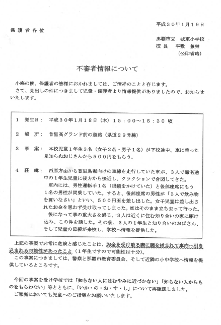 不審者情報 投稿日時 : 2018/01/19 情報担当 本日、児童に不審者情報についてのプリントを配布しています。1月18日(木)の15時頃、首里高グランド前の道路から本校児童が見知らぬおじさんに声をかけられたようです。今回は大事にならなかったのですが、非常に危険と感じる事象ですので、子ども達に「いかのおすし」の指導をして下校させています。週末ですので、子ども達が外出する際には気をつけるようお声かけください。