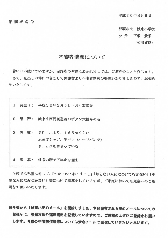 本日、不審者情報のプリントを児童に配布しています。今回は城東小学校付近と言うこともあり、より一層の注意をしてください。子どもたちにはプリント配布のほか、「いかのおす」の確認をして、気をつけて下校するよう話をしています。帰宅後も、外出する際には注意喚起を行うと共に、一人で行動することのないようお声かけください。