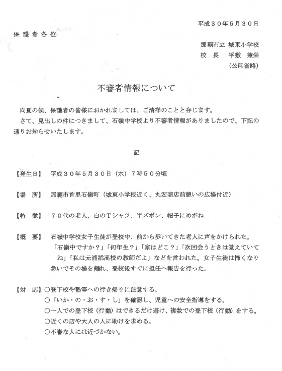 不審者情報 投稿日時 : 2018/05/30 情報担当 本日の7時50分頃に城東小学校付近で不審者情報がありました。学校では、不審者情報のプリントを配布し、「いかのおすし」の確認、下校時や下校した後の過ごし方の確認、不審者には近づかないなどの話をしています。お子様が帰宅後にもう一度気をつけるようお話しください。