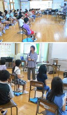 リコーダー講習会 投稿日時 : 2023/06/05 校長 今年から初めて音楽のリコーダーに取り組む3年生に向けて,“リコーダー講習会”が行われました。講師は髙江洲ひろこ先生です。授業の最後には,6種類のリコーダーを演奏して下さいました。子ども達は,興味深く聴き入っていました。