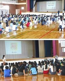 非行防止教室 投稿日時 : 2023/06/06 校長 1~3年生と4~6年生を対象に2回に分けて『非行防止教室』を行いました。“いじめ・万引き”について,那覇警察署少年課の諸見里さんと大田さんに講話いただきました。終わった後には,いろいろな質問等を受けての回答もありました。