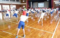 今年の運動会で披露する“エイサー”。5年生は初めて踊ります。そこで,夏休み前の今日,5学年全体で足の上げ方や手の伸ばし方等を教えてもらいました。夏休み中にどのくらい様になっているのかな。