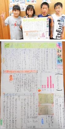 4年生の国語の学習で新聞作りに取り組みました。校長先生へのインタビュー記事も載せてあるので見て欲しいと,校長室に来ました。グラフや写真を入れたり,色を変えたりするなどの工夫もありました。