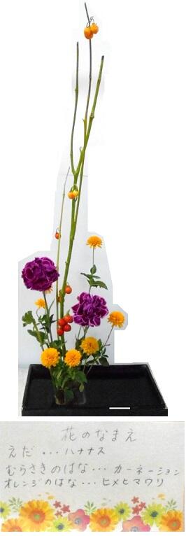 今週の生け花 投稿日時 : 2023/09/27 校長 可愛い実をつけたハナナスが後ろにそびえ立ち,紫のカーネーションとオレンジのヒメヒマワリが下で咲いている力強さと色合いのコンビネーションが素晴らしいです。