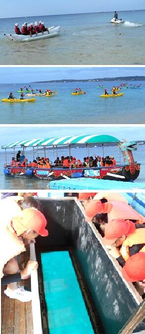 2日目はマリン体験。バナナボートやシーカヤックに乗ったり,グラスボートで沖縄の海の自然,珊瑚礁やそこに生きるお魚たちを観察したりしました。