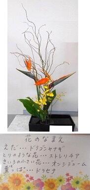 緑のクチバシを持った鳥のような花『ストレリチア』と黄色い『オンシジジューム』がポイントになって,『ドラセナ』が羽ばたいている様子。『ドラゴンヤナギ』は,今にも飛び立とうとしている背景を表しているように見えます。