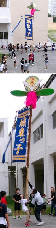 明後日の日曜日に本番を迎える『旗頭フェスタ in なは』。今日が最後の練習日です。そこで,練習旗ではなく,本旗を持ってみました。風に押されて重く感じたようですが,最後まで持ちこたえました。明後日の本番 “がんばるぞ! オー!!”