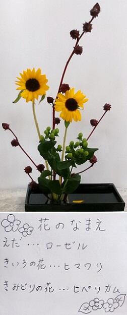今週の生け花 投稿日時 : 2024/10/30 校長 ローゼルの紅紫色の茎の先についた丸く膨らんだつぼみと緑色の茎の先についたヒペリカムのつぼみが,今にも咲きそうな状態にあり,黄色く咲いた2輪のひまわりとのコントラストが印象的です。
