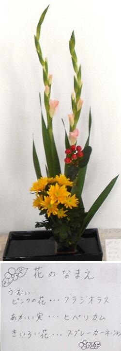 今週の生け花 投稿日時 : 2024/11/06 校長 黄色いスプレーカーネーションの右上に赤いヒペリカム,その後ろに高くそびえるグラジオラスが,鉢の右側に活けてあります。右側の重量感と左側の空間があって初めて,全体を支えています。