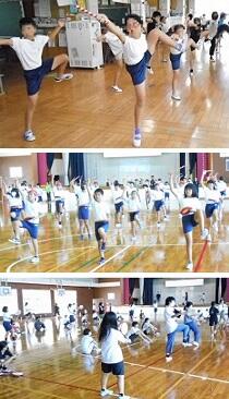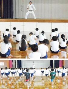 4年生の運動会の演技の一つに,空手があります。沖縄小林流空手道協会守武館上間道場の上間建 副館長に基本の『受け』や『突き』『けり』,そして『普及型Ⅰ』等をご指導いただいています。