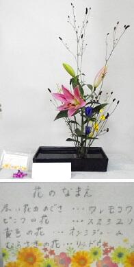 ピンクの大きなスカシユリが左を向いていて,その右側には,紫のリンドウの花と黄色いオンシジュームが配されています。そして後ろには,赤い野草ワレモコウと今か今かと咲くのを待つスカシユリのつぼみが見守っています。