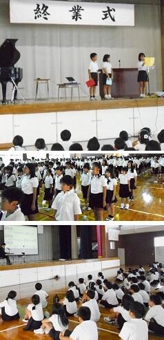 今日は『1学期終業式』前半は68日と後半28日の合計96日間が,学校に通った日数でした。1学期にがんばったことと2学期にがんばりたいことを2・4年生が代表で発表しました。どの代表の児童も自分の考え・意見をしっかりと持って発表していました。