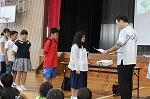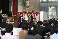 児童から花束を受け取り、離任職員にあいさつをしてもらいました。