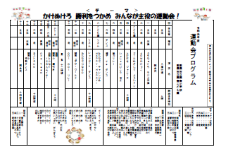 競技種目は一人で、縄跳び、竹馬、ドリブル、袋跳び、一輪車、ボール運び、ペアになって、二人三脚、デカパン、最後は、チームワークの光る台風の目でゴールです。