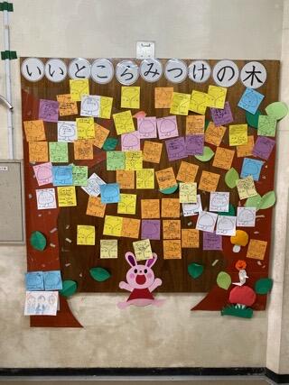 児童のいいところを見つけたらメモをして貼り付けていく「いいところみつけの木」を中央階段一階に設けています。