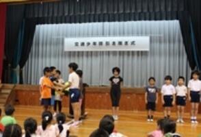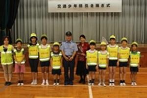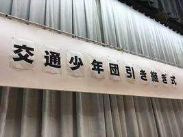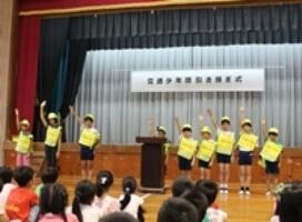 お話朝会の時間に、交通少年団の引き継ぎ式を行いました。