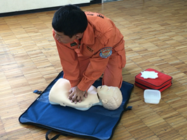 胸骨圧迫や人工呼吸、AEDについて、隊員の方々が体験談を交えながら説明されました。