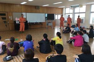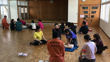 放課後、西消防署の方々をお迎えして救命救急法の講習会を全職員が参加して行いました。