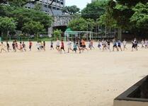 児童は運動場を横切って体育館に避難します。