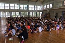 体育館では校長先生が「おかしもち」についての話をしました。