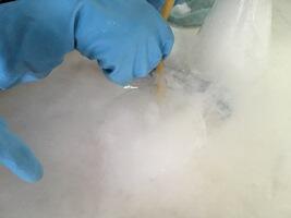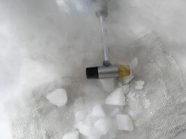 ドライアイスを水に入れると、白い水蒸気の煙がモクモクと立ち上ります。