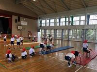 前転、開脚前転、好転、側方倒立回転、倒立などの技を、お互いに声を掛け合いながら練習しています。
