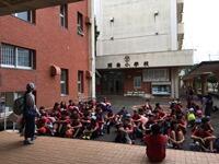 運動場での実施を予定していた体育朝会でしたが、あいにくの土砂降りの雨でした。