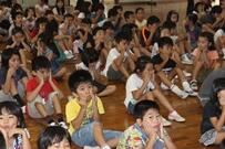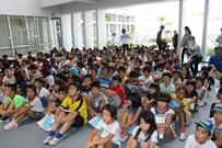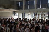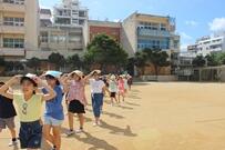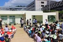 「地震避難訓練です。那覇市沖で地震が発生しました。今後も揺れが続く恐れがあるため、運動場へ避難します。」