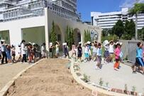 5年生、4年生、幼稚園児は西門から、1~3年生、6年生は幼稚園正門から市庁舎へ向かいました。