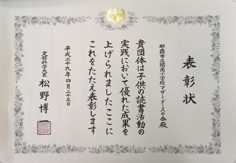 4月23日に国立オリンピック記念青少年総合センターで開催された、平成29年度子どもの読書活動推進フォーラムにおいて、本校の「マザーグースの会」が、沖縄県から神原中、美里工業高校と共に文部科学大臣表彰を受けました。