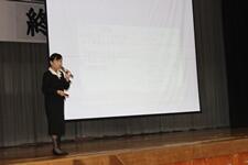 演舞の前に、PTA会長が学校紹介と70周年記念事業のPRを行いました。