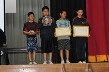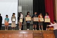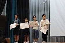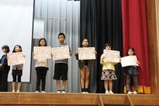 善行賞、ボランティア活動、ポスターコンクール、テニス、体操、サッカー、野球、読書感想文・感想画、旗頭フェスタ、版画、書き初めなどで入賞した子たちの賞状が多数届けられました。