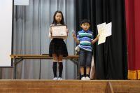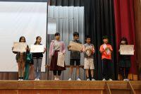 はじめに読書感想文と感想画、空手、俳句コンクールで活躍した子の表彰をしました。