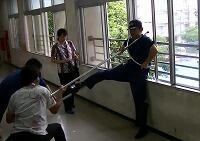 4年生の教室に訪れた不審者役に対峙して、職員が説得を試みます。