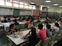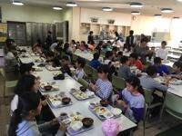 1組と2組がイスと机を持ち寄ってふれあいプラザに集まりました。