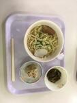 沖縄そばとジューシーおにぎり、冷たいもずくのセットで昼食です。