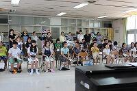 1組と2組がイスと机を持ち寄ってふれあいプラザに集まりました。